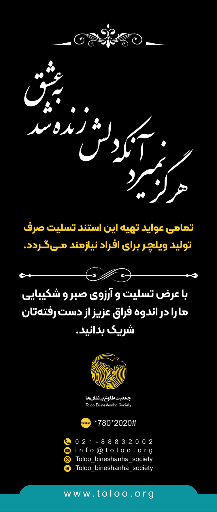 جمعیت طلوع بینشانها این امکان را فراهم کرده است تا با اهدای استند تسلیت، ضمن ابراز همدردی با خانوادههای عزادار، یاد و نام عزیزان از دسترفته را به نیکی زنده نگه دارید و همزمان در مسیر کمک به افراد آسیبدیده و بیپناه سهیم باشید.
